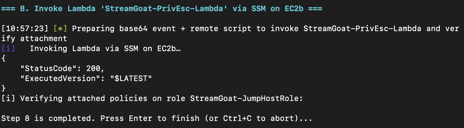 We discovered three roles configured in the account, and identified that StreamGoat-AttachRolePolicy-Role has the permissions we’re looking for. We create a Lambda that assigns the AdministratorAccess default policy to StreamGoat-JumpHostRole.