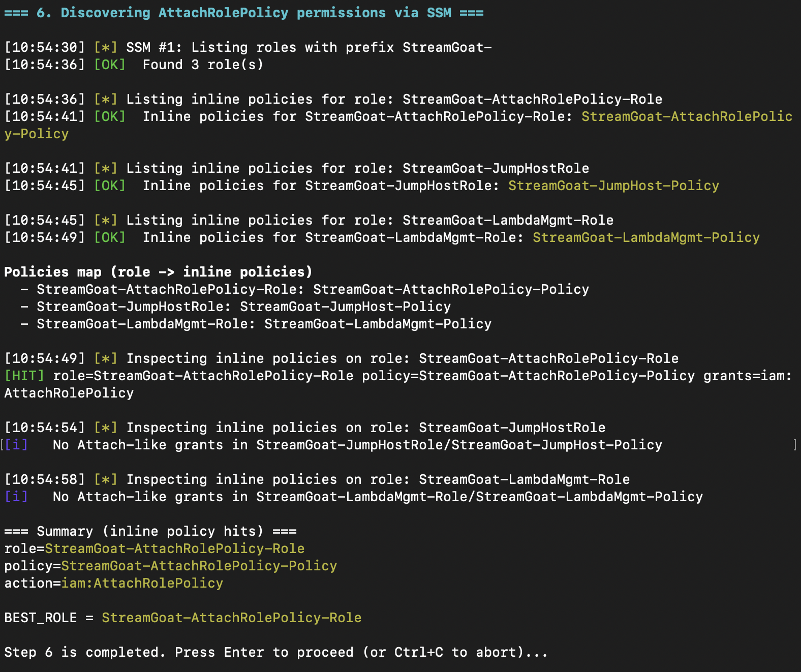 We directly query "who am I?" and "what can I do?" instead of manual enumeration. This works because EC2b has these permissions: iam:ListRoles, iam:ListRolePolicies, iam:GetRolePolicy and iam:GetRole.