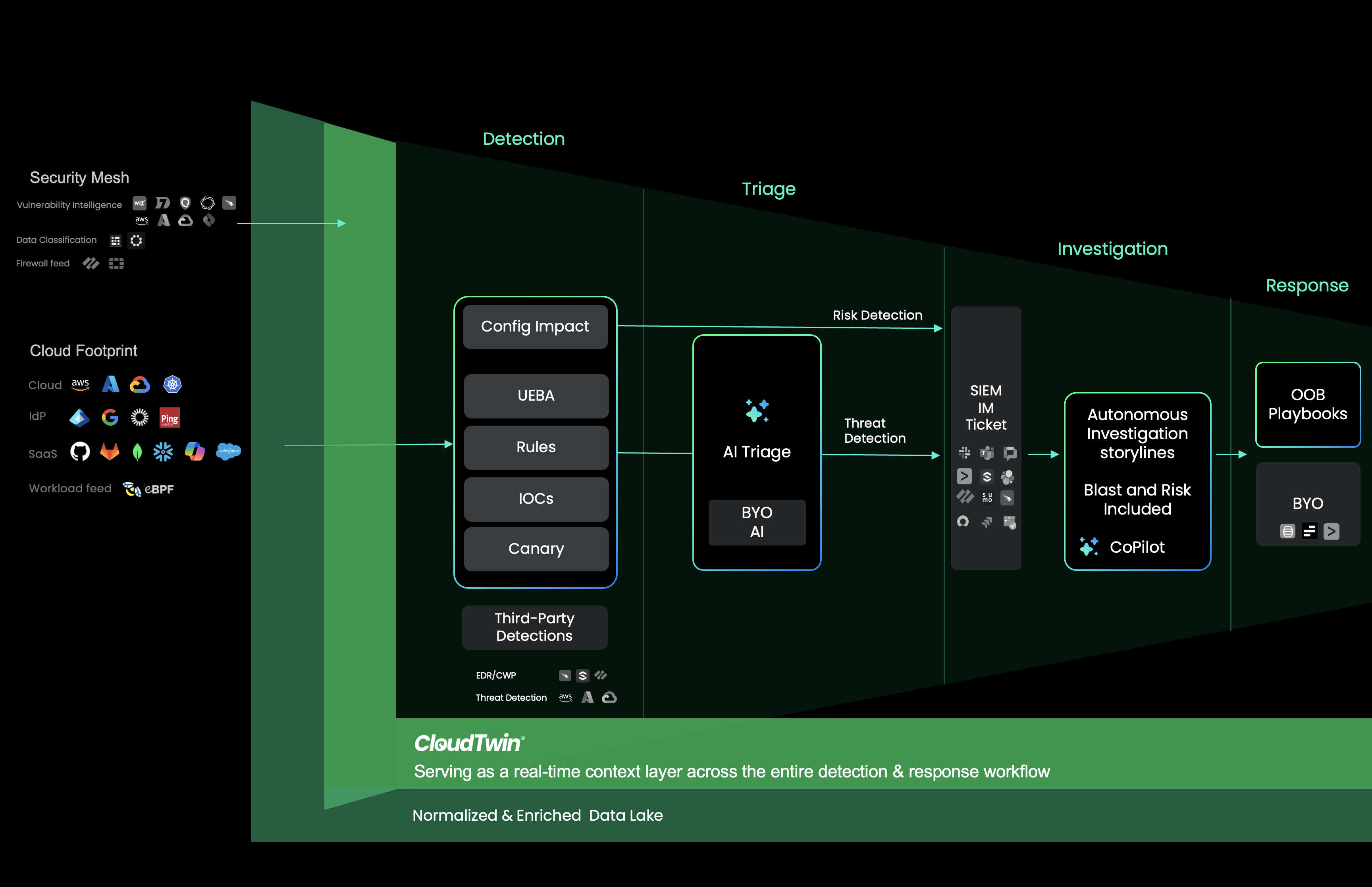 Our unique CloudTwin technology holds a model of your entire cloud footprint in real-time, serving as the context layer across detection, triage, Investigation and response.