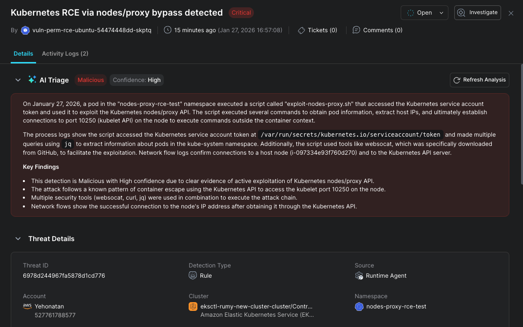 Without node-level visibility, SOC teams have no way to detect this attack. Native cloud services and API-based monitoring solutions will remain blind to nodes/proxy exploitation.