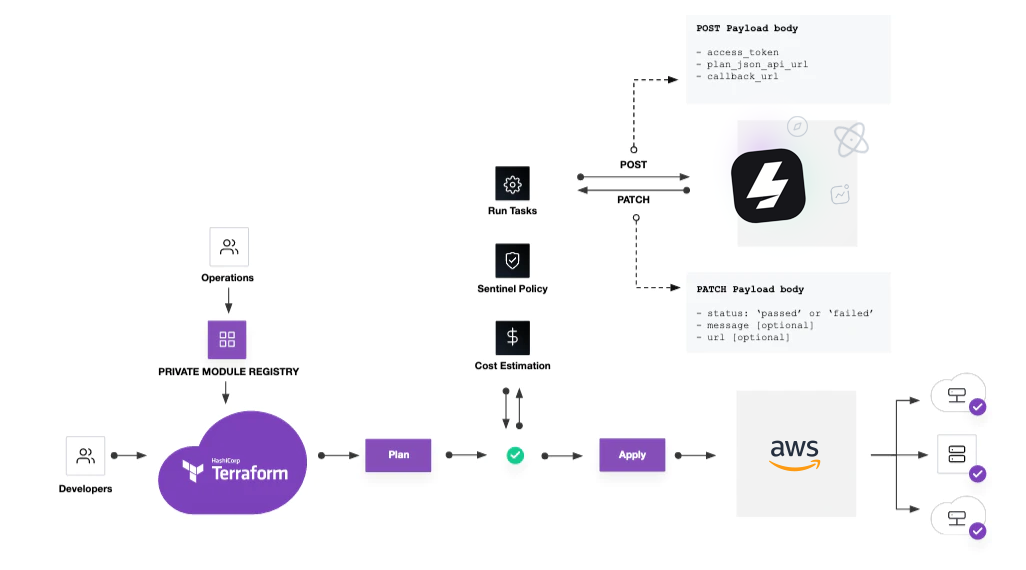 The run tasks feature enables your organization to integrate third-party tools within a Terraform run, specifically between the plan and apply stages of the Terraform Cloud workflow. A run task works by sending run-related information to Stream Security. Stream then uses a real-time representation of your cloud environment and will simulate proposed changes as if your Terraform code was already deployed.