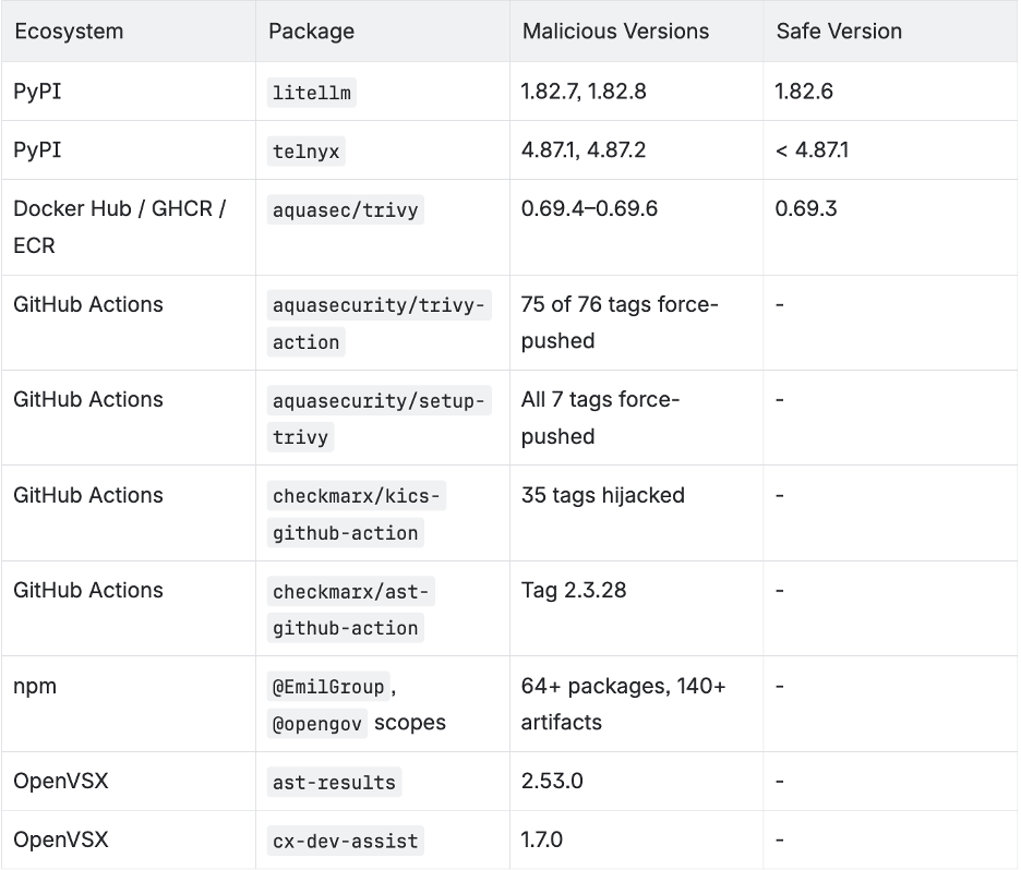 The TeamPCP campaign spans five ecosystems. This blog focuses on LiteLLM, but the IOCs below cover the full campaign - if you use Trivy, KICS GitHub Actions, any of the affected npm packages, or Telnyx, check these as well.