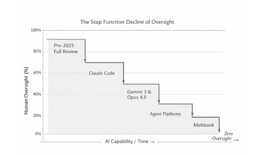 Finally, autonomous agents and AI-to-AI systems emerged. At that point, oversight didn’t just decline. It became structurally impossible.