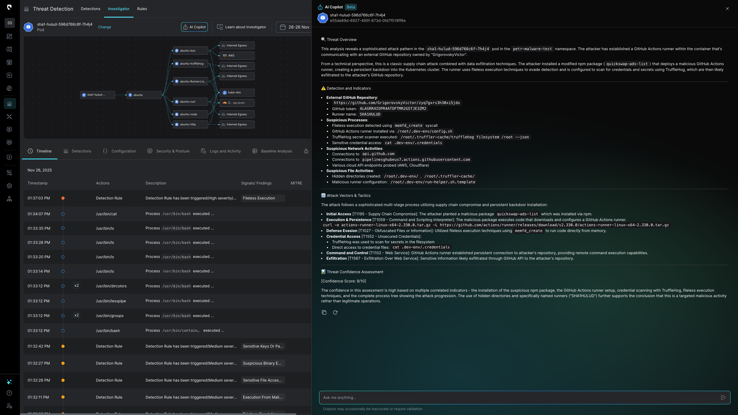 To demonstrate this, we deployed an infected npm package into a Kubernetes pod to observe its behavior and evaluate how Stream.Security detects and analyzes the threat in real time.